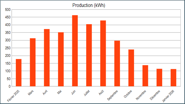 Un relevé effectué sur la totalité de février indique une prodution de 177 Wh, une consommation de 364 Wh, un export de 111 Wh, un import de 298 Wh, la pompe à chaleur comptant pour 210 Wh. L'économie est quant à elle de 66 Wh. Je ne vois pas trop où est la rentabilité telle que les commerciaux nous la font miroiter, même si ce sera mieux cet été.